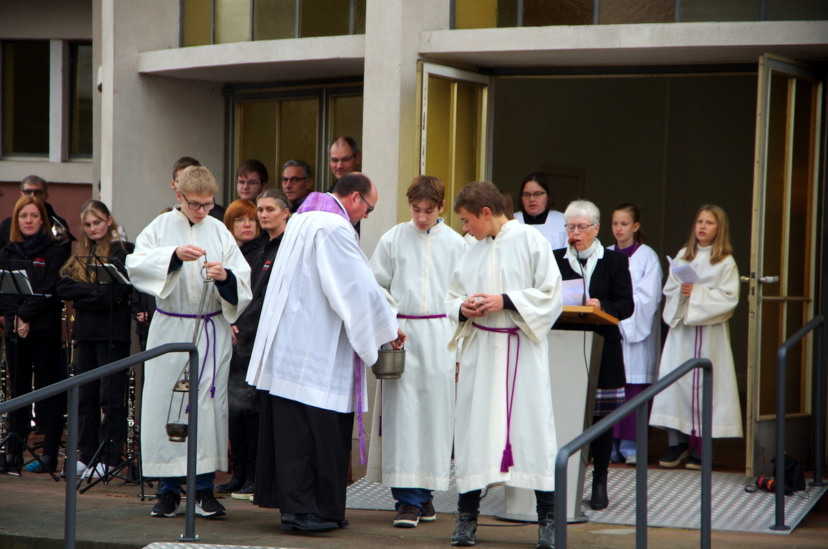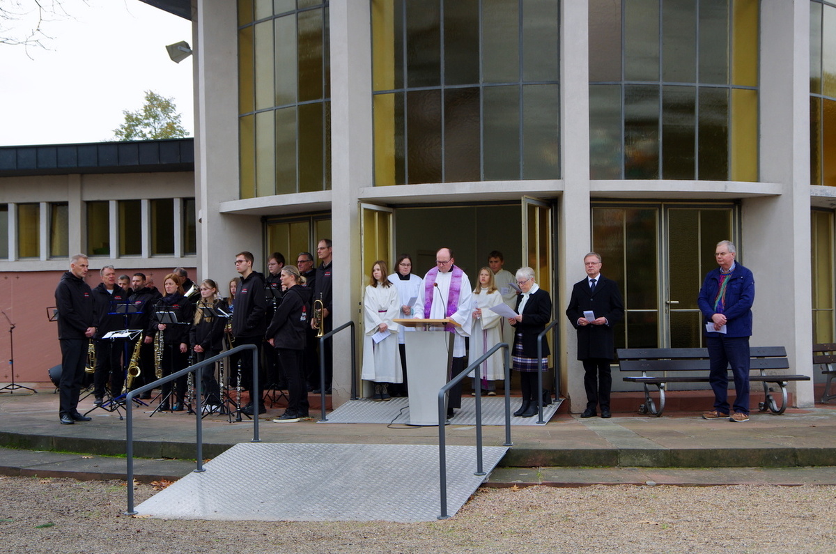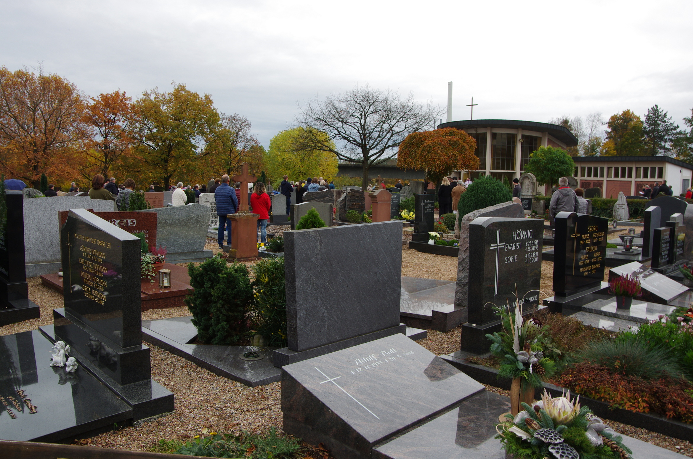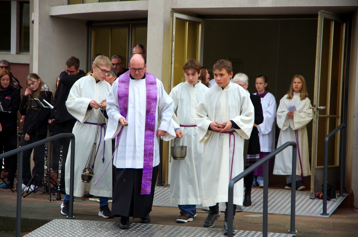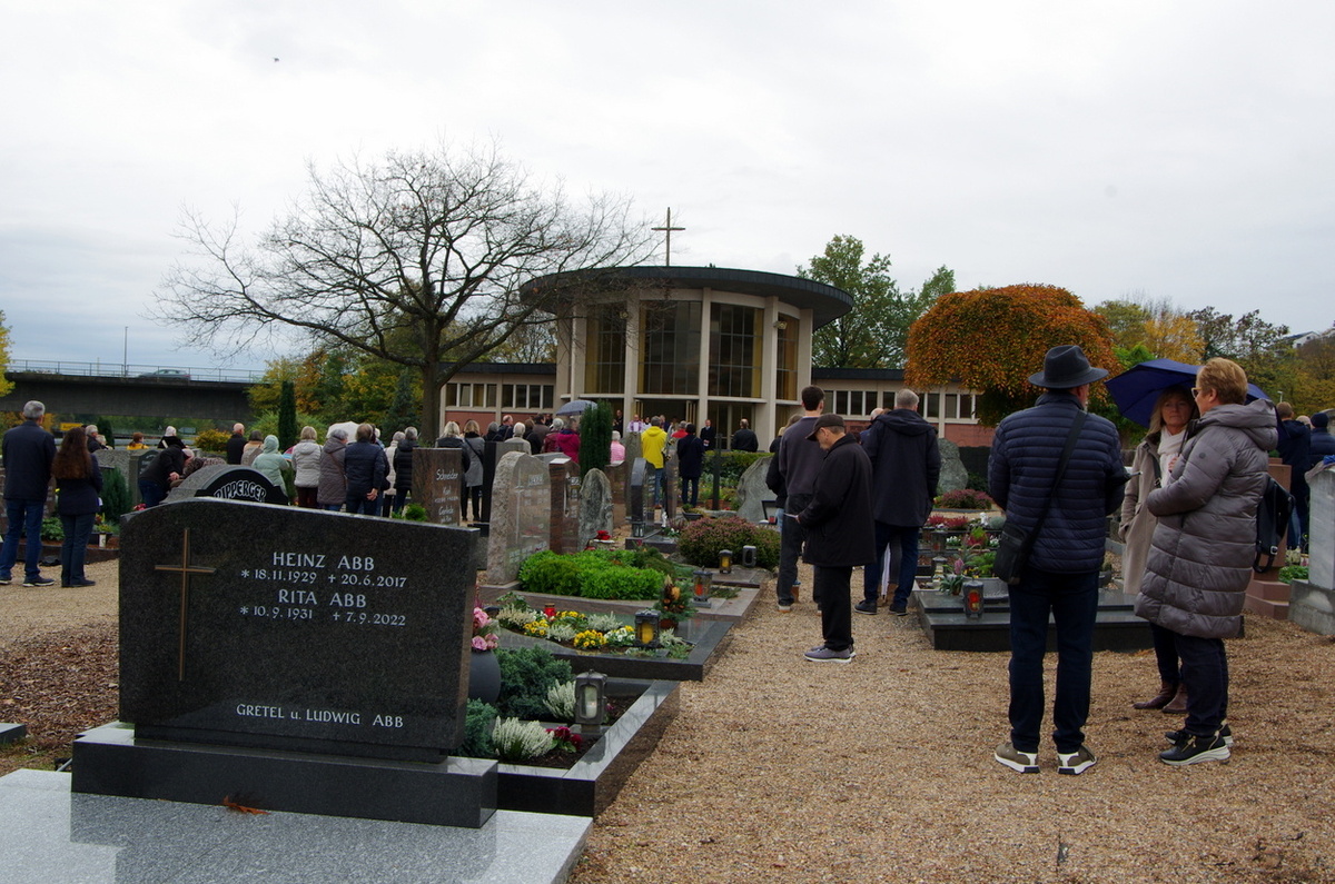 Auch auf dem Friedhof wurden die Namen der Verstorbenen verlesen und der Pfarrer ging mit den Messdienern, Weihwasser und Weihrauch zu allen Gräbern. Es wurde sowohl für geliebte Verstorbene gebetet als auch für die, an die niemand mehr denkt. Bürgermeister Dietmar Fieger erinnerte an das Ende des 2. Weltkrieges vor 80 Jahren und die ca 65 Millionen Opfer. Er mahnte, aus den Erfahrungen der Vergangenheit zu lernen und nicht nur Frieden, sondern auch Demokratie nicht für selbstverständlich zu erachten. "Beides wuchs in der Stunde Null aus den Trümmern einer Welt".