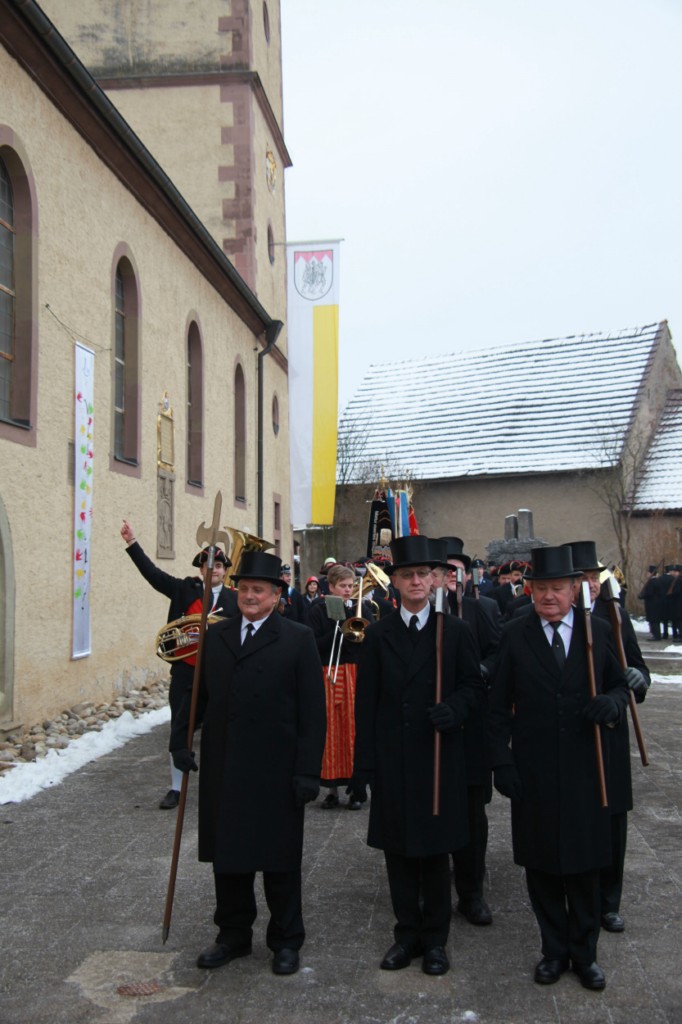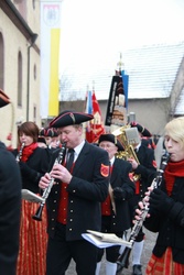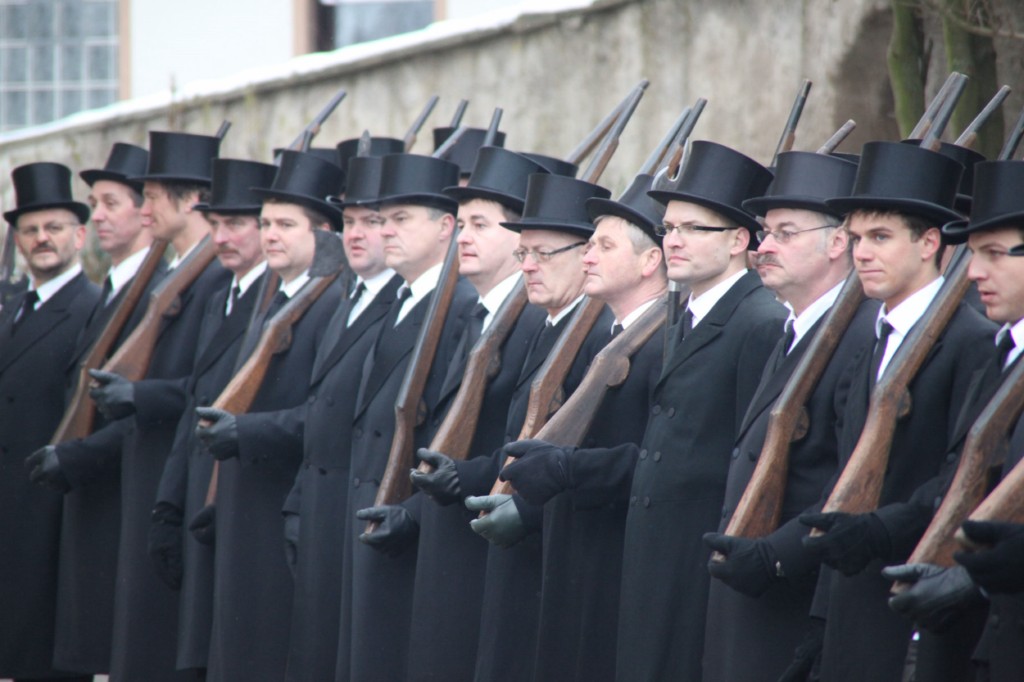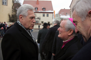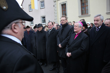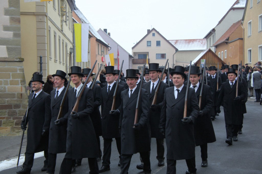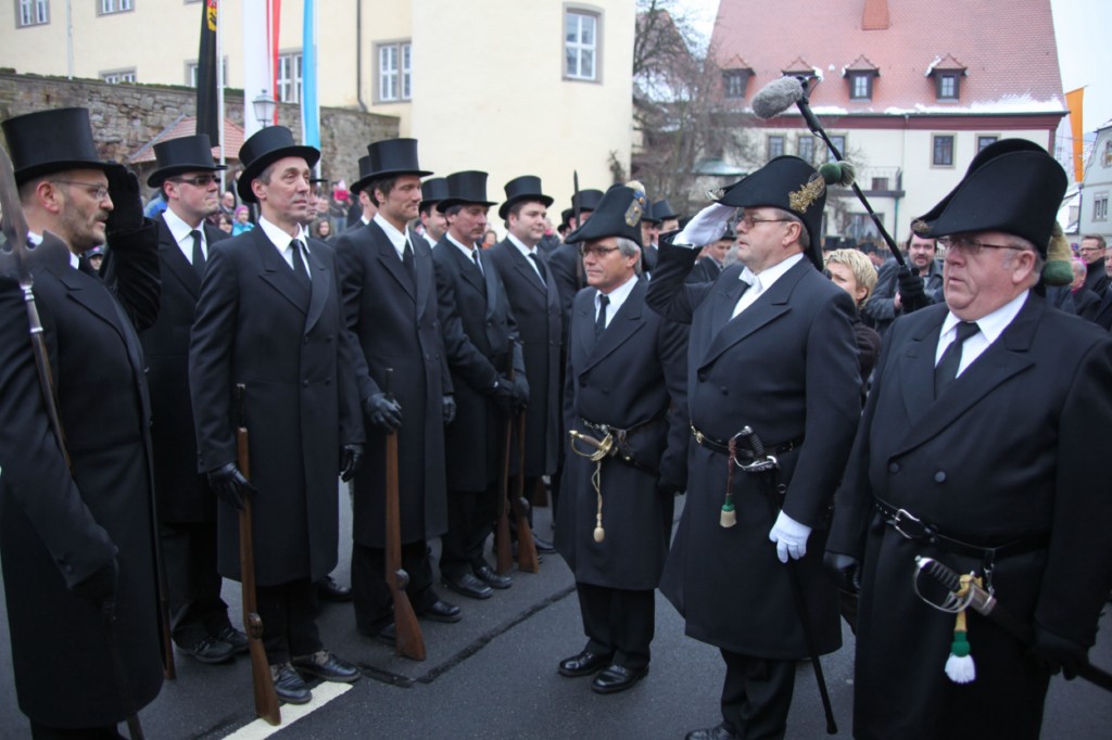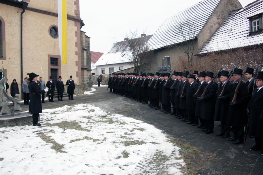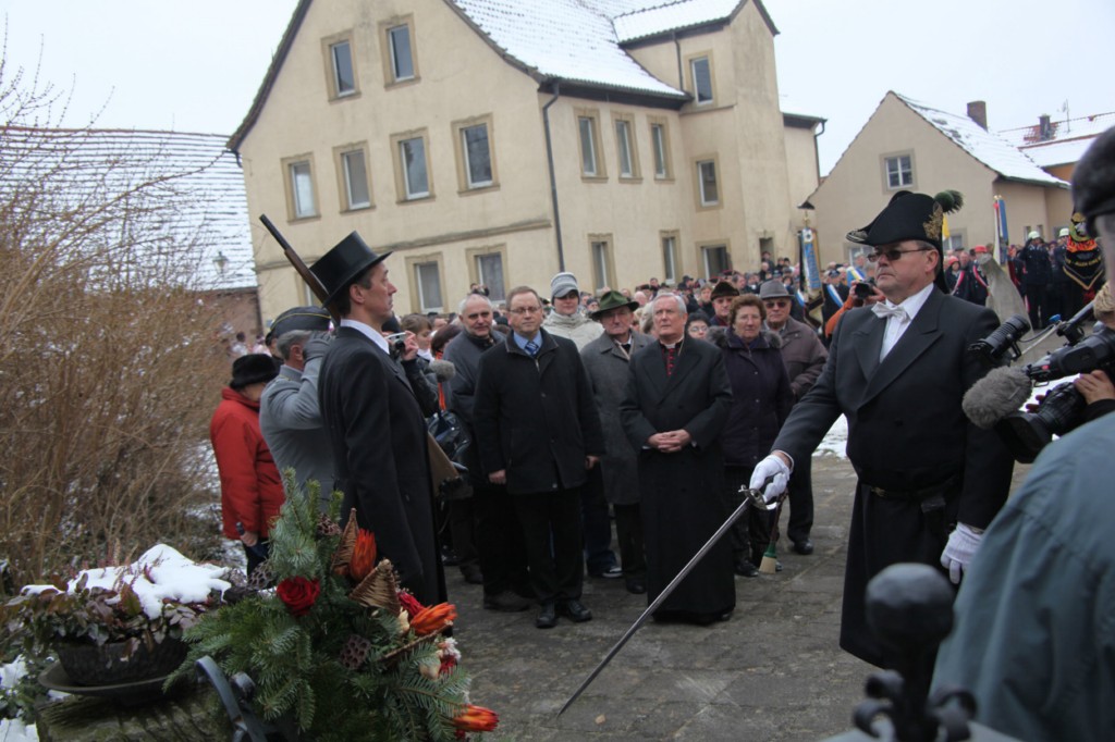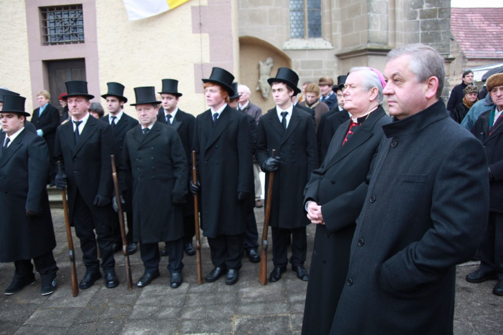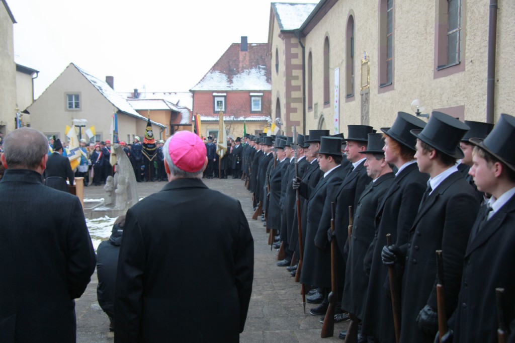 Begrüßung vor dem Festgottesdienst in Oberschwarzach im Landkreis Schweinfurt: Bürgerwehr-Hauptmann Georg Wagner (links) begrüßt Bischof Dr. Friedhelm Hofmann und die Ehrengäste.