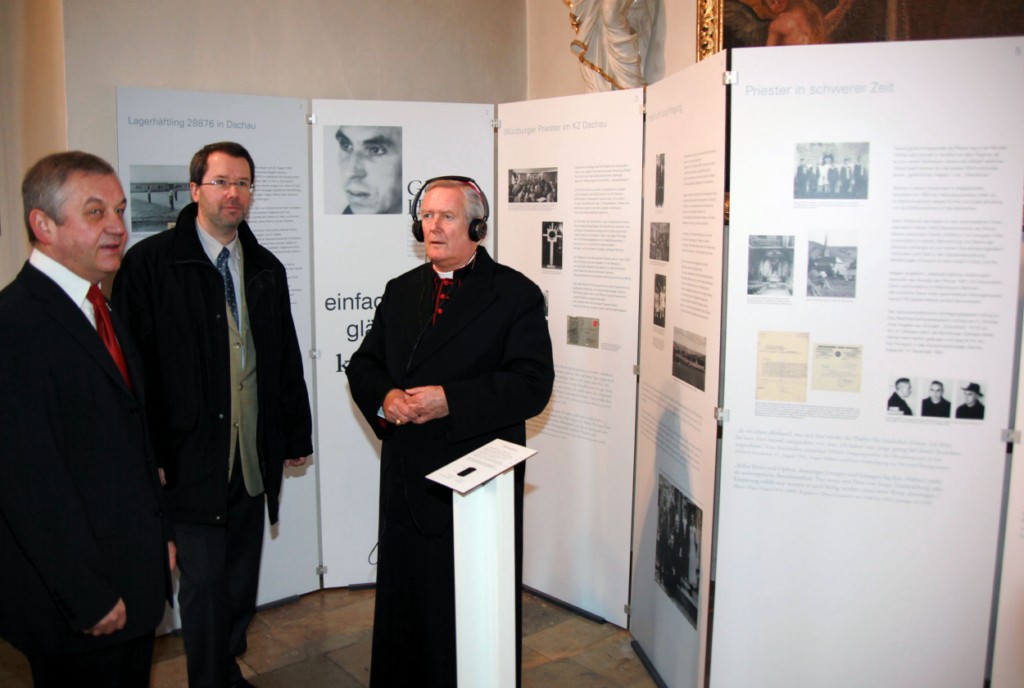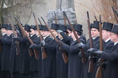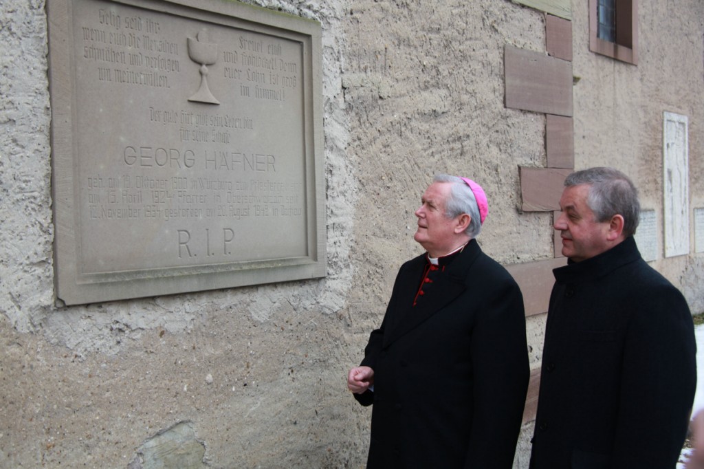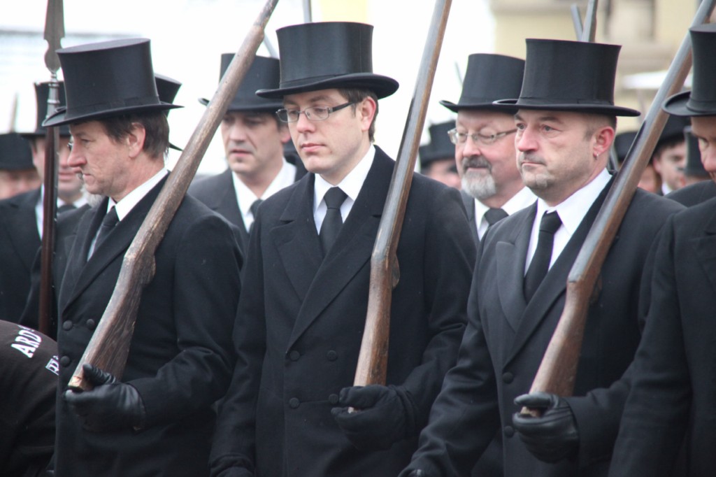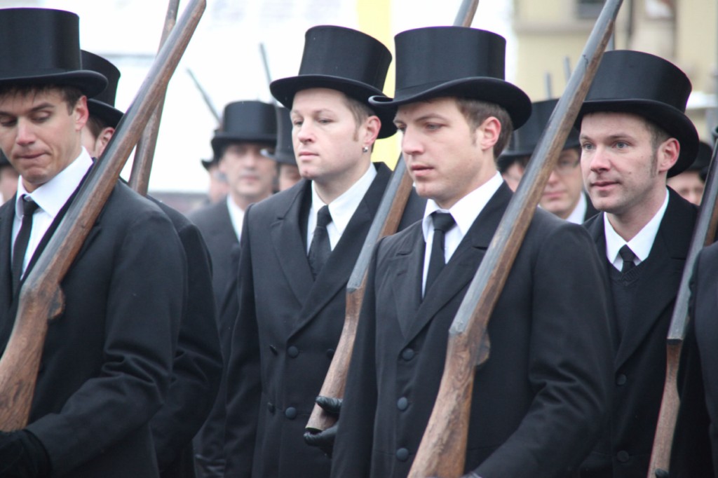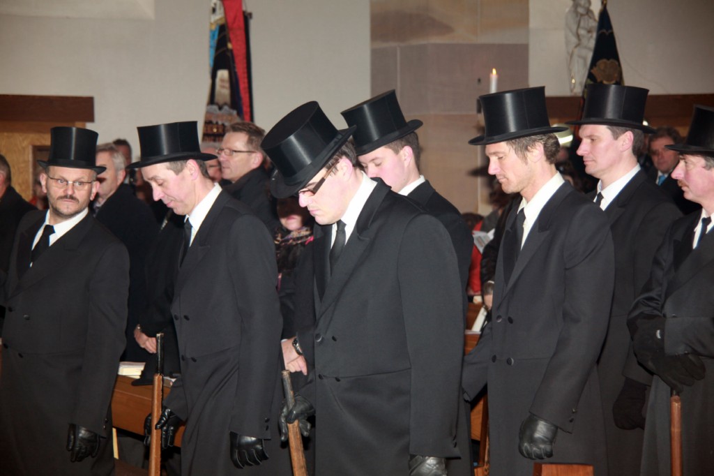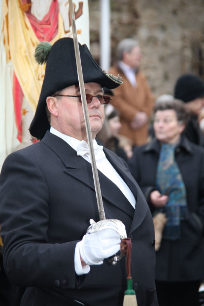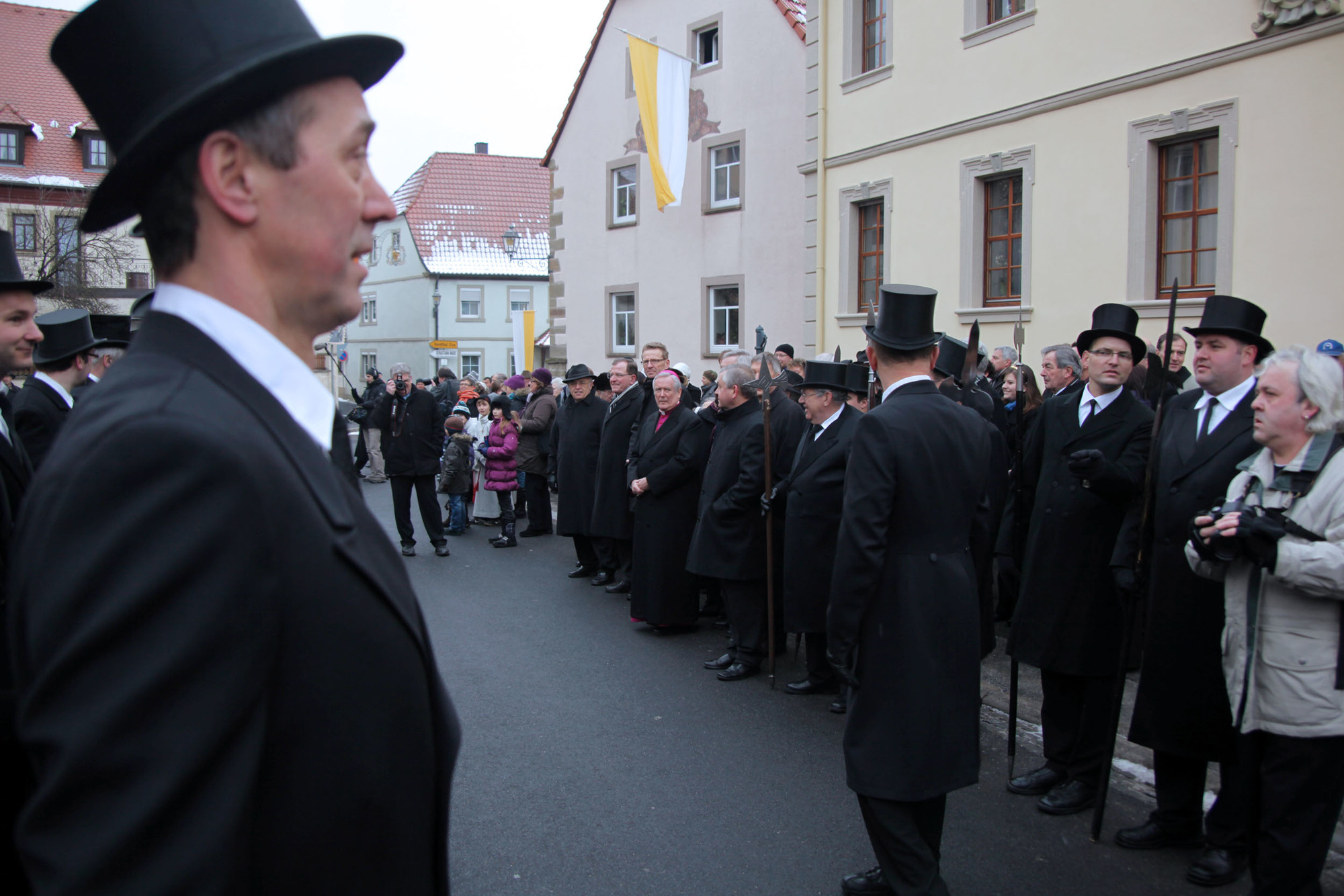 Begrüßung vor dem Festgottesdienst in Oberschwarzach im Landkreis Schweinfurt: Bürgerwehr-Hauptmann Georg Wagner (links) begrüßt Bischof Dr. Friedhelm Hofmann und die Ehrengäste.