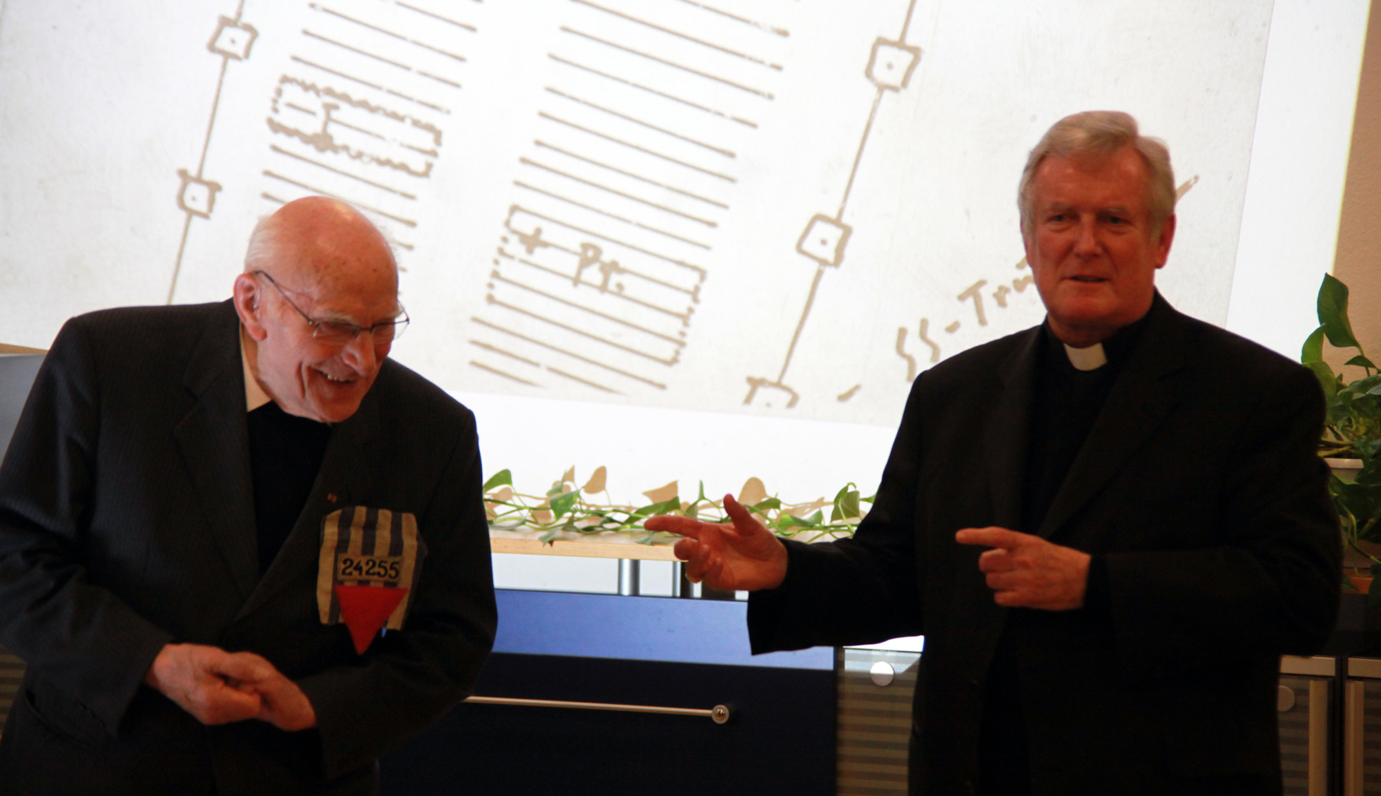 Würzburg/Münsterschwarzach (POW) Wer Prälat Hermann Scheipers zuhört, muss genau hinhören. Er redet leise, aber überzeugt von seiner schwersten Zeit im Leben. Für ihn ist es ein Wunder, überlebt zu haben. Der 97-Jährige war von 1941 bis 1945 im Konzentrationslager Dachau gefangen und lebte in derselben Stube wie Pfarrer Georg Häfner, der am 15. Mai im Würzburger Kiliansdom seliggesprochen wird. Am Mittwoch, 12. Januar, war Scheipers zu Besuch im Egbert-Gymnasium in Münsterschwarzach. Vor den Schülern, die derzeit die Aufführung eines Oratoriums zu Häfners Leben vorbereiten, berichtete er von seinen schrecklichen Erlebnissen.