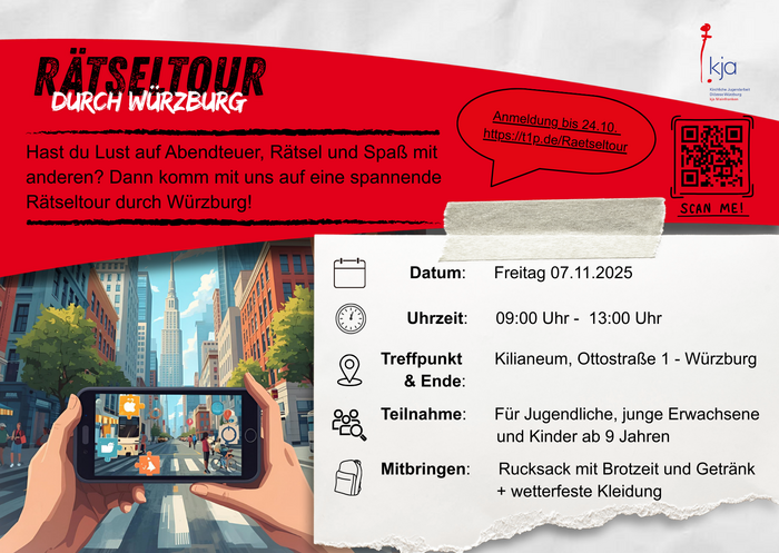 In kleinen Teams macht ihr euch mit einem Tablet oder Handy, das ihr von uns bekommt, auf den Weg durch die Stadt. An verschiedenen Stationen warten knifflige Rätsel, kreative Aufgaben und spannende Hinweise, die euch zu besonderen Orten in Würzburg führen. Dabei braucht ihr Teamgeist, Köpfchen und Entdeckerfreude. Ob geheimnisvolle Plätze, historische Orte oder bekannte Ecken der Stadt - überall gibt es etwas zu entdecken. Gemeinsam löst ihr die Aufgaben, sammelt Punkte und erlebt Würzburg auf spielerische Art und Weise. Es gibt zwei verschiedene Spiele: Eines für Kinder ab 9 Jahren und eines für Jugendliche und junge Erwachsene. Die Gruppe wird entsprechend aufgeteilt. Zum Abschluss treffen wir uns wieder im Kilianeum wo wir die Tour gemeinsam ausklingen lassen und noch etwas Zeit zum Austauschen und Zusammensein haben.