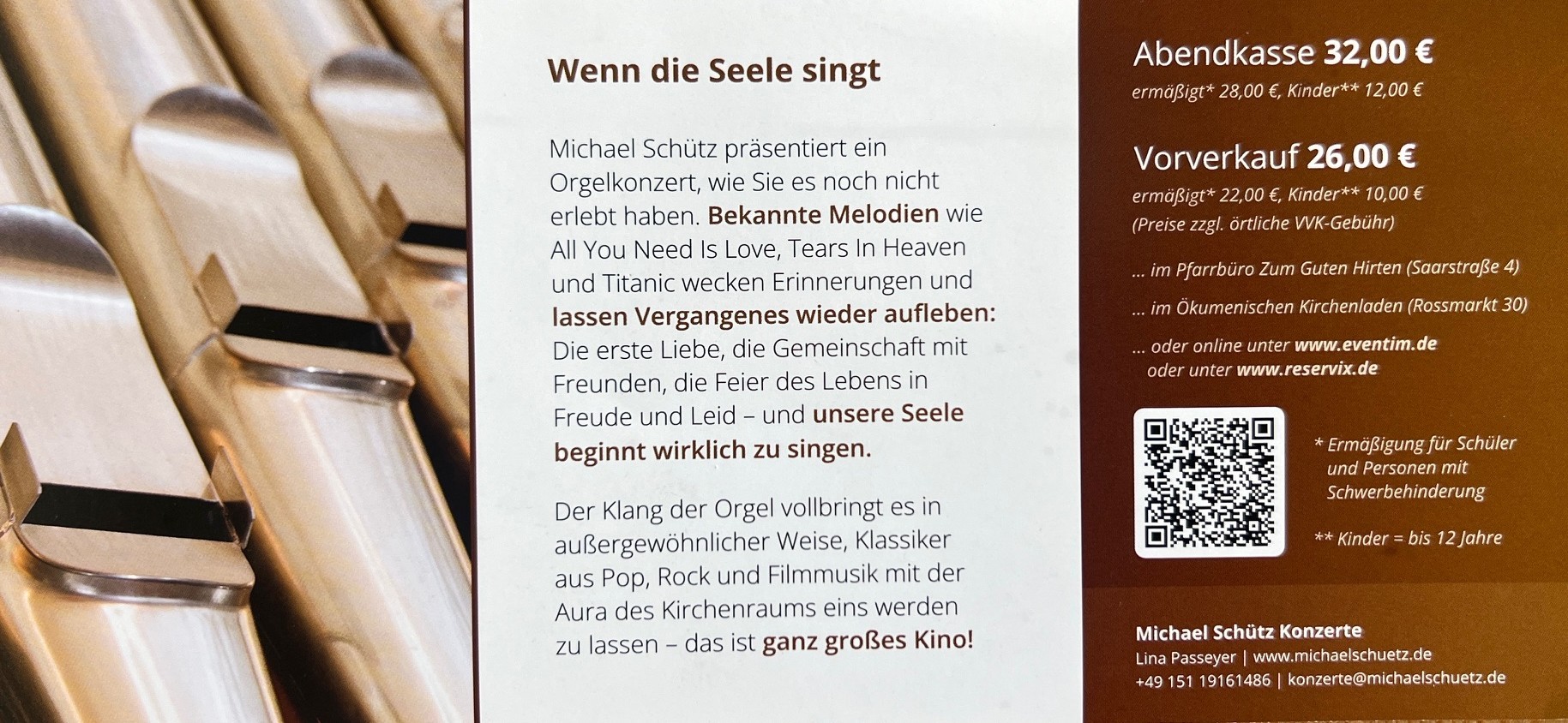 Michael Schütz, der bereits 2023 zu Gast in der Herz-Jesu-Kirche war und sein Publikum damals begeisterte, lädt zu einem weiteren Konzert an der Vleugelsorgel ein. Er präsentiert ein Orgelkonzert, wie es die Besucherinnen und Besucher "noch nicht erlebt haben", so schreibt er. Bekannte Melodien wie All You Need Is Love, Tears In Heaven und Titanic wecken Eronnerungen und lassen Vergangenes wieder aufleben. Die erste Liebe, die Gemeinschaft mit Freunden, die Feier des Lebens in Freude und Leid - und unsere Seele beginnt wirklich zu singen, heißt es in seiner Ankündigung.